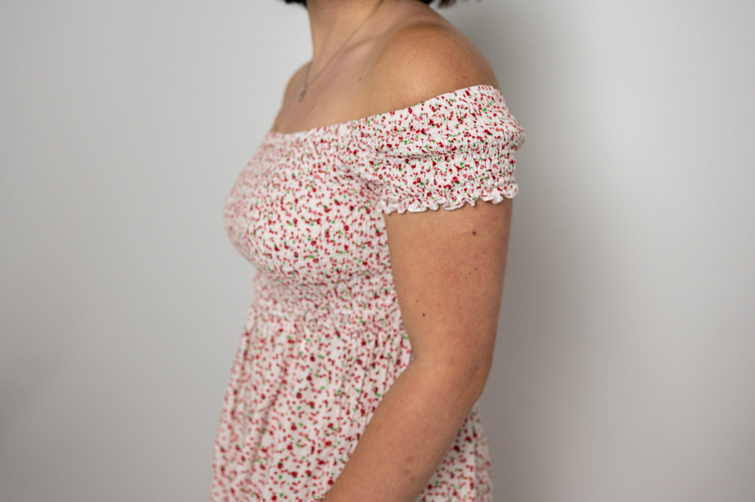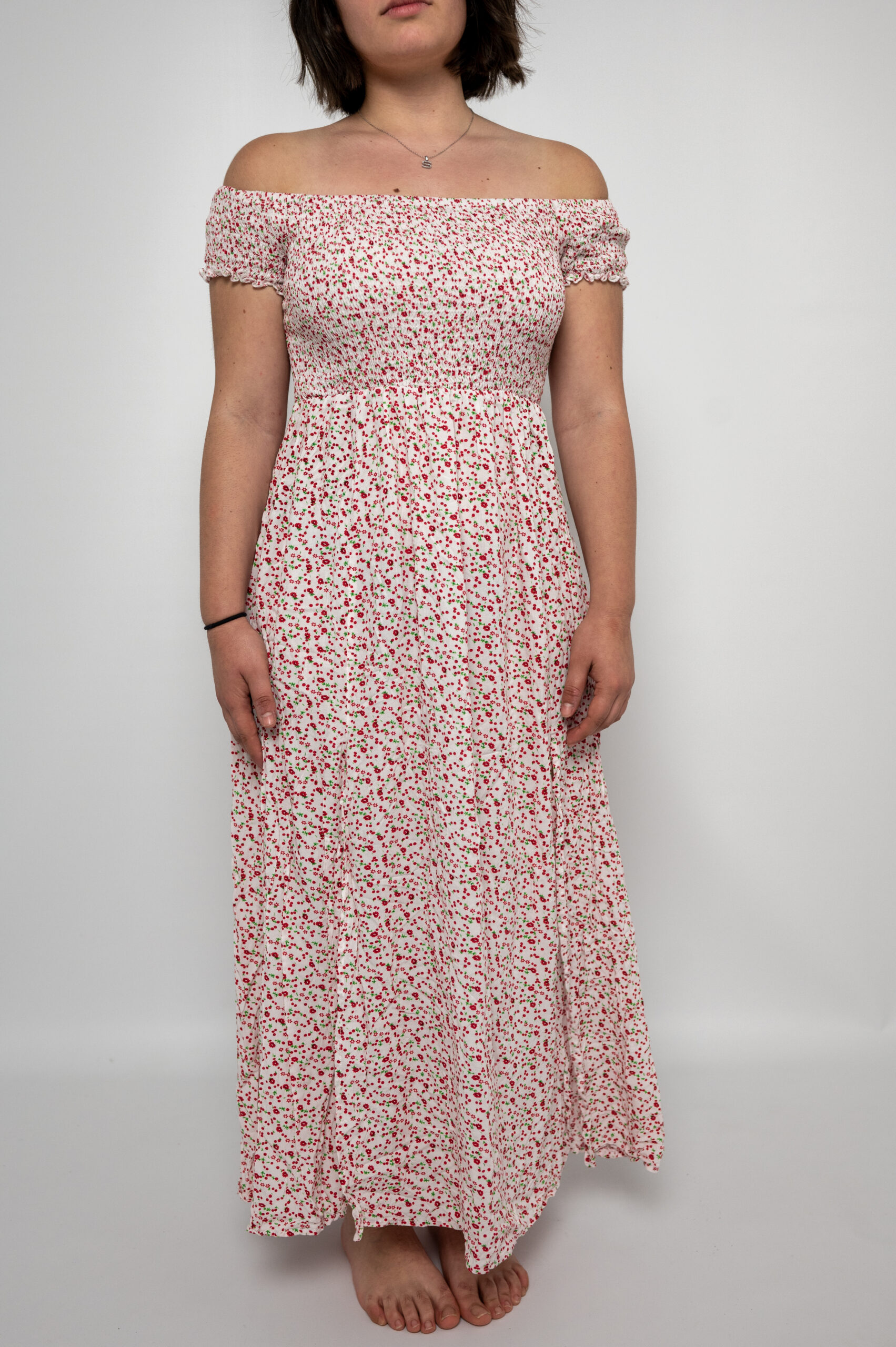 Vestito lungo con scollo a barchetta con spacchi nei lati e bustino pieghettato